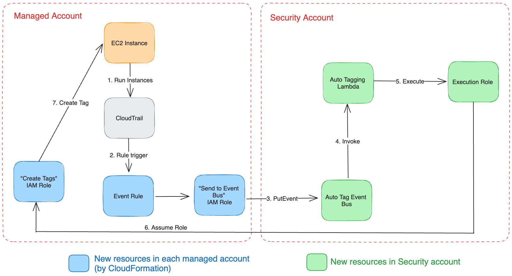 The second problem - that the example focused on just one account - was a little trickier to think about. Event rules can send events to Lambda functions only in the same account as the rule. We needed a way to send events from other accounts in the organization to our account, and then another mechanism to apply the tags back onto the correct instances in those various accounts.